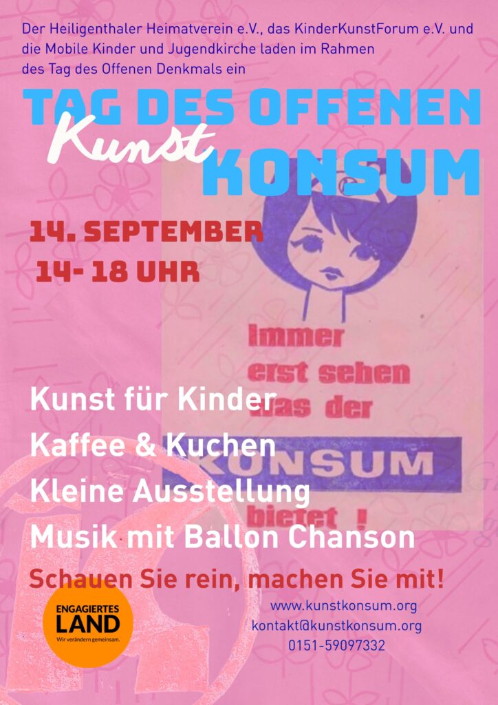 Am 14.September ab 13 Uhr zum Tag des Offenen Denkmal öffnet auch der Kunstkonsum seine Türen, für Jung und Alt, zum Mitmachen, Musik lauschen, Kaffee trinken und die Ergebnisse unserer Arbeit bestaunen.